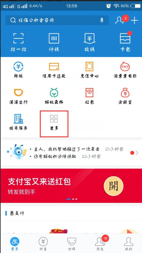 进入支付宝首页中我们可以看到页面可以添加的小程序,还可以展开更多进去查看。