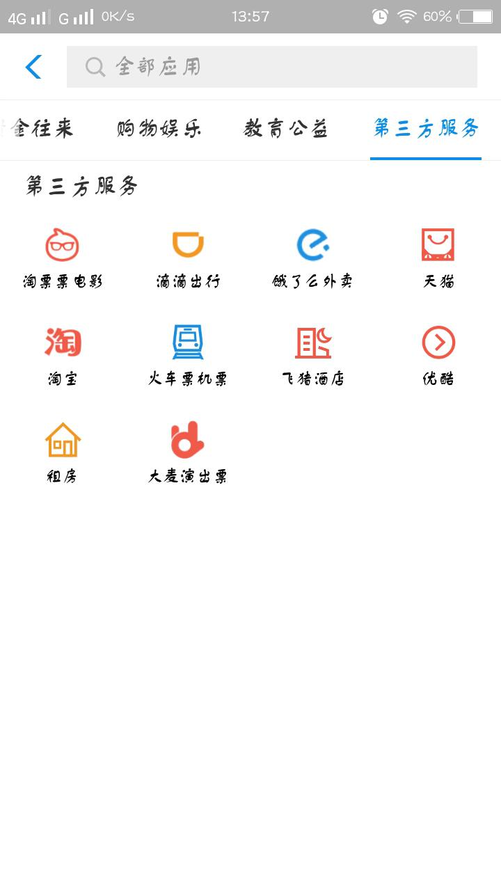 进入到全部应用的页面中,可以看到第三方服务的这些小程序分别有:淘票票电影、滴滴出行、饿了么外卖、天猫、淘宝、火车票机票、飞猪酒店、优酷、租房、大麦演出票。