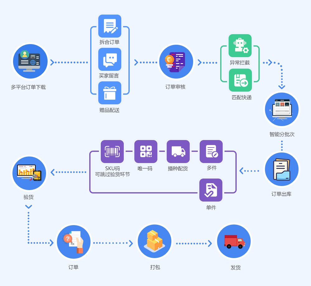 有订单系统会自动处理,并且扫描验货极速出货发货,不但有效的提高了工作效率,并且还能在类似与双十一、双十二这种日均千万订单都能快速的处理,能够无故障处理0漏单。