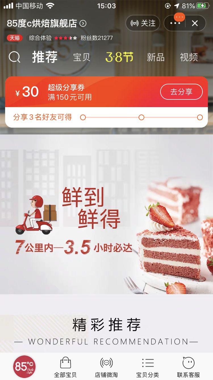 85°C作为老牌蛋糕零售企业,在天猫和美团上都开设了线上店铺,通过电商新零售模式做到了订单、库存、营销的统一管理,实现了线上线下的互联互通。