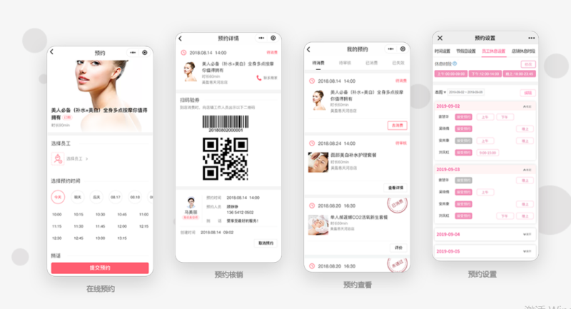 美容行业是典型的O2O行业,所以对于美容院来说,从线上到线下的链接是个不小的问题。在使用小程序之前,美容店只能通过电话和第三方平台完成预约流程,这种方式比较混乱不好统计。在小程序进入美容行业之后,小程序很好的发挥了自身的优势,即搜即用,用完即走,非常简便。